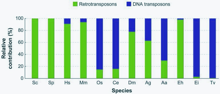 轉(zhuǎn)座因子(Transposable element,簡(jiǎn)稱(chēng)TE),又稱(chēng)“跳躍基因”,是指從基因組的一個(gè)位置移動(dòng)到另一個(gè)位置的DNA序列。這類(lèi)因子最早由遺傳學(xué)家芭芭拉·麥克林托克于50多年前發(fā)現(xiàn)。起初,生物學(xué)家對(duì)麥克林托克的發(fā)現(xiàn)持懷疑態(tài)度。然而,在接下來(lái)的幾十年里,人們逐漸發(fā)現(xiàn),TE不僅會(huì)“跳躍”,而且?guī)缀醮嬖谟谒猩矬w(包括原核生物和真核生物)中,而且通常數(shù)量巨大。例如,TE約占人類(lèi)基因組的50%,占玉米基因組的90%。