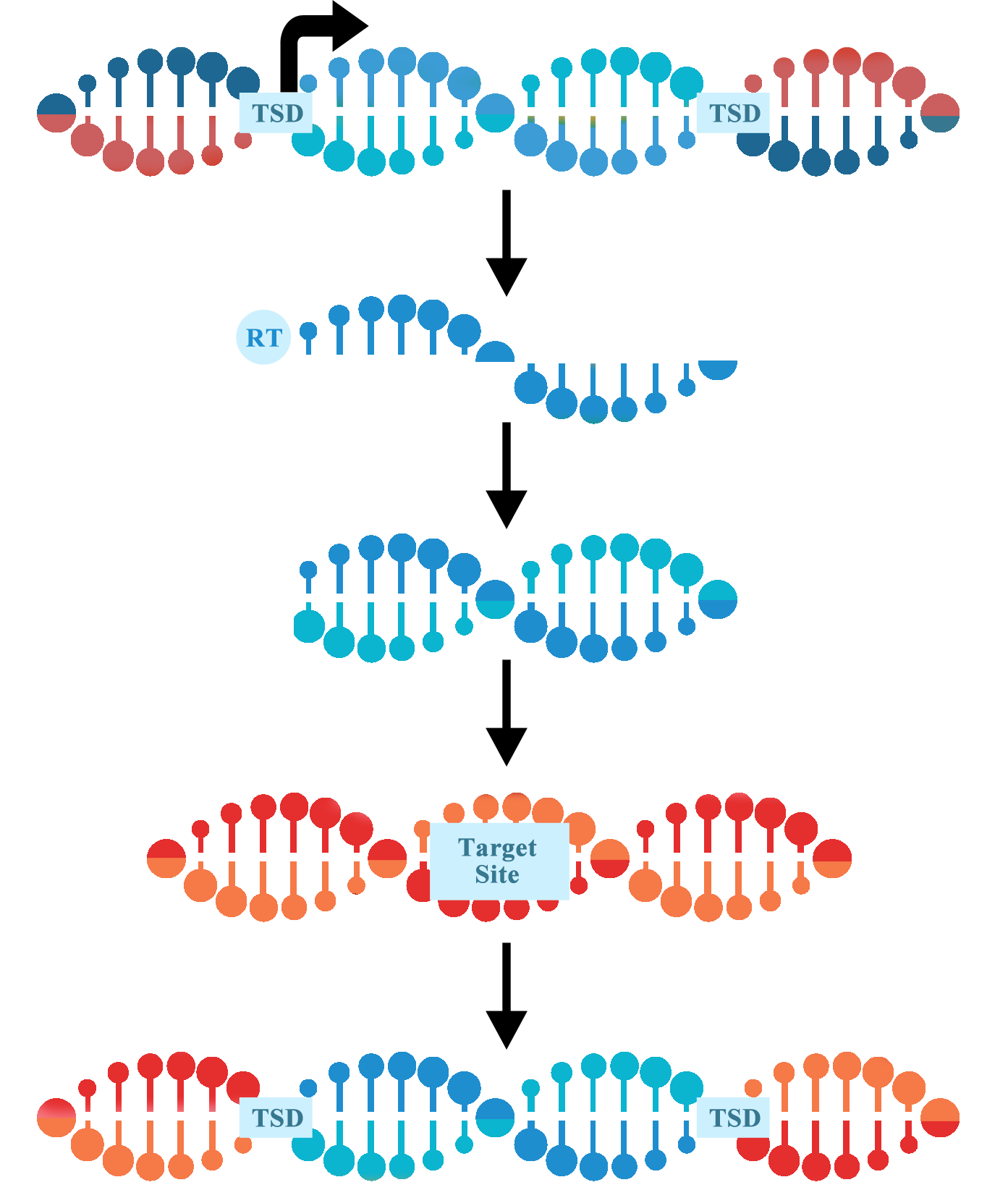 圖 1:逆轉(zhuǎn)錄轉(zhuǎn)座子轉(zhuǎn)座概述。逆轉(zhuǎn)錄轉(zhuǎn)座子通過(guò)“復(fù)制粘貼Ctrl C+V”機(jī)制進(jìn)行移動(dòng)。