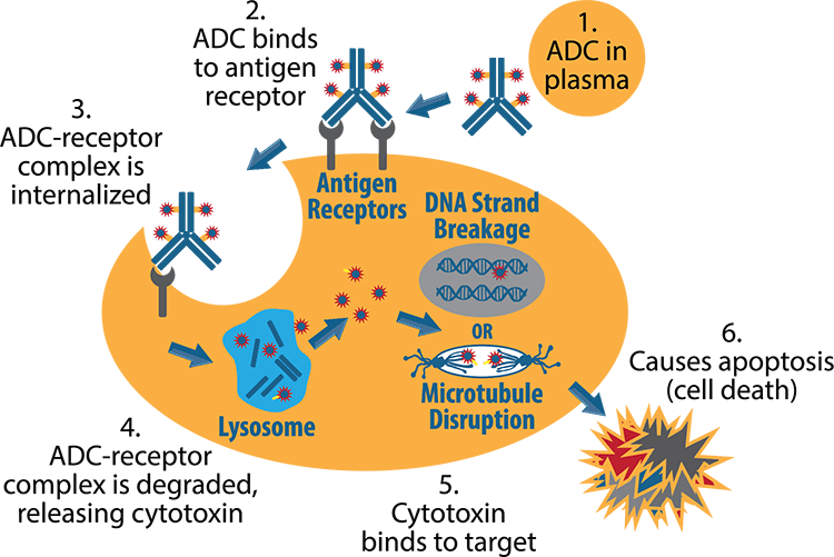 ADC藥物通過靜脈注射到血液中,隨著血液的流動,到達(dá)全身,但是科學(xué)家估計只有0.1%的ADC能到達(dá)患者的癌細(xì)胞。大部分會在循環(huán)系統(tǒng)和其他器官及組織中逐漸分解。到達(dá)癌細(xì)胞的ADC藥物一般是經(jīng)歷6個過程來起作用。