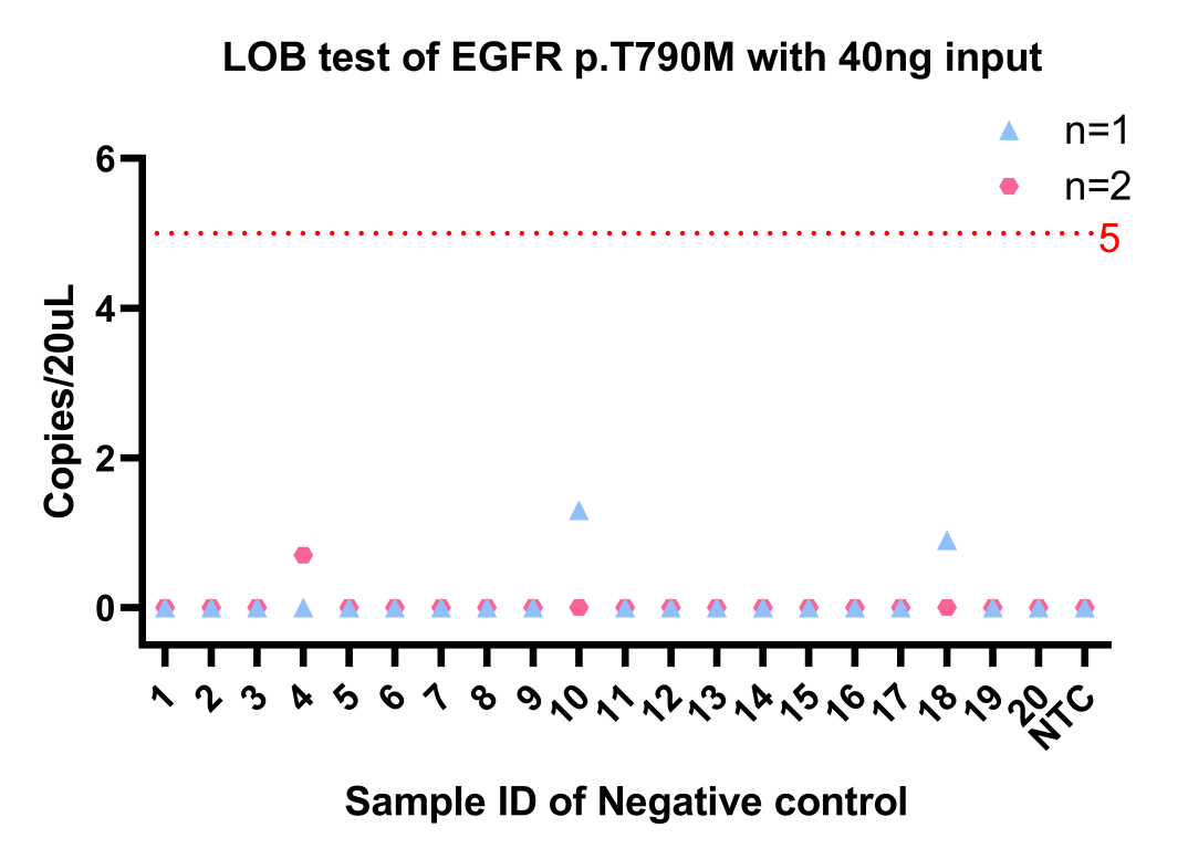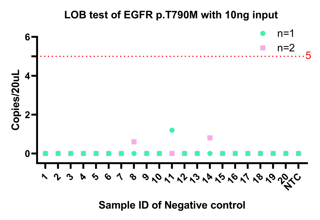 首先使用EGFR T790M的對應(yīng)的陰性標(biāo)準(zhǔn)品,對50%的標(biāo)準(zhǔn)品進(jìn)行有限稀釋,每個(gè)梯度使用陰性樣本兩倍稀釋,接著對11個(gè)樣本進(jìn)行檢測。