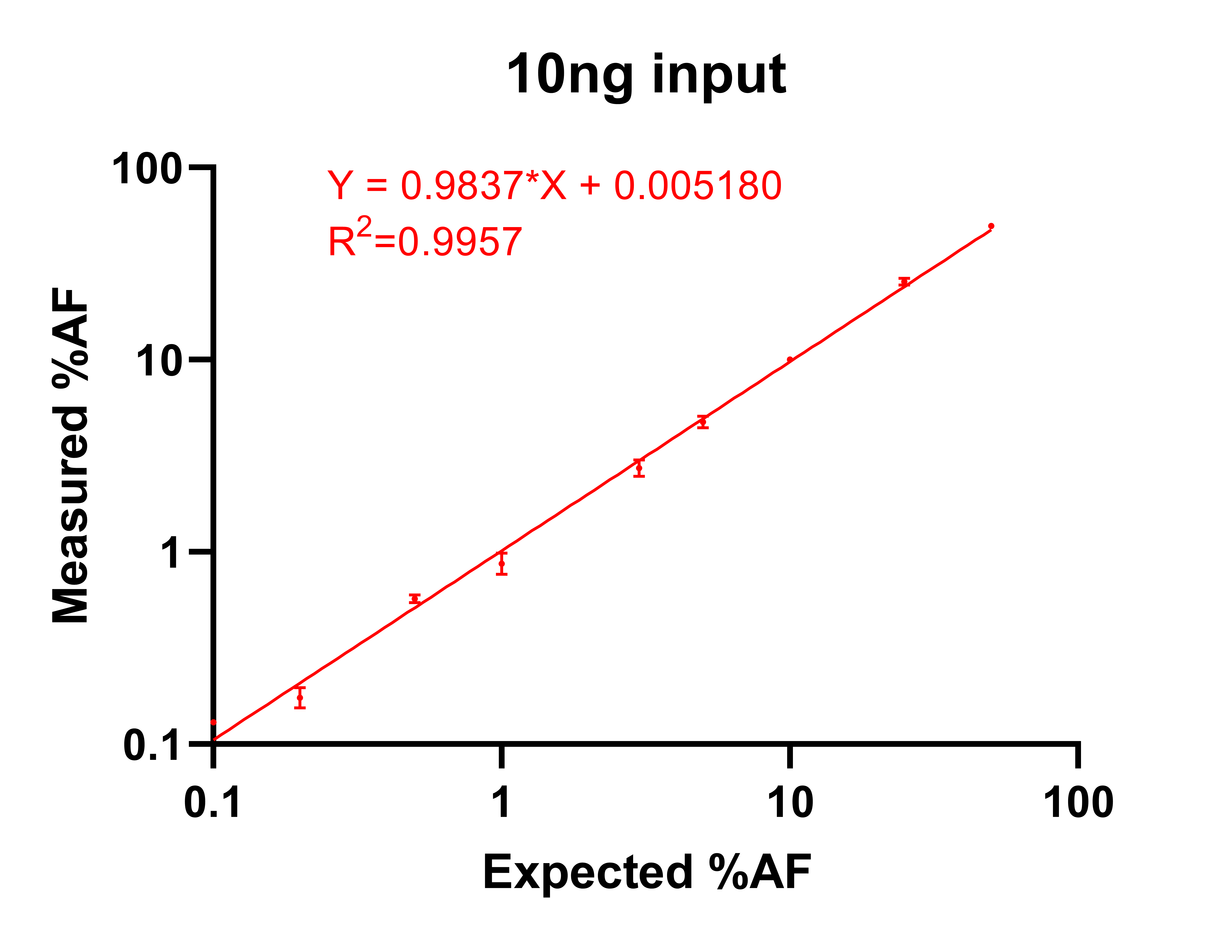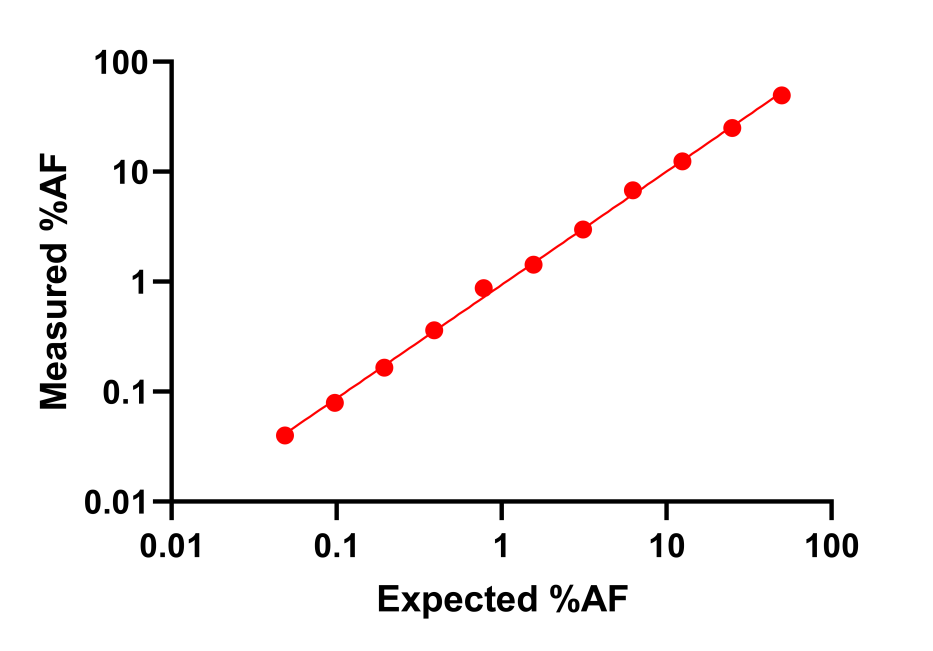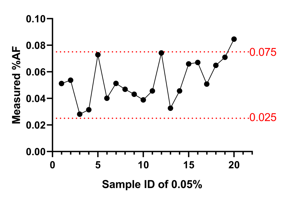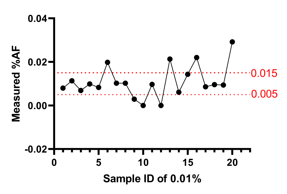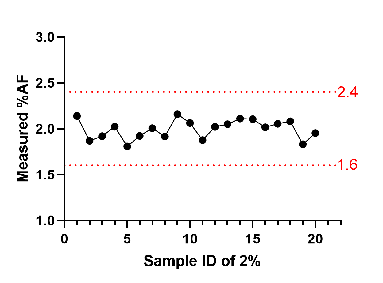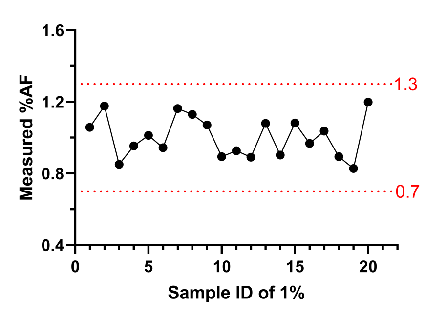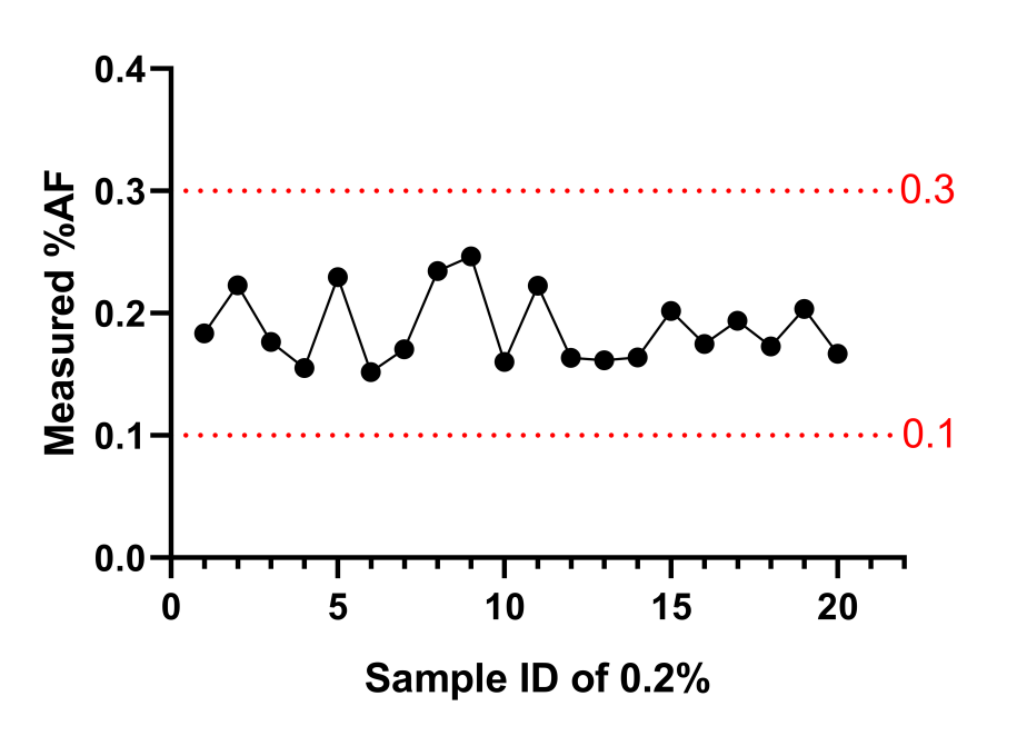由上數(shù)據(jù)可見:在10ng的投入量下,AF%呈現(xiàn)非常好的線性稀釋,存在波動(dòng),但是都在誤差范圍內(nèi)。