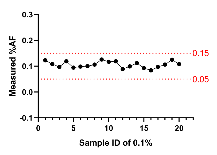 對20個(gè)0.1%的樣本進(jìn)行數(shù)字PCR檢測,觀察在0.05-0.15%以內(nèi)是否達(dá)成95%檢出。
