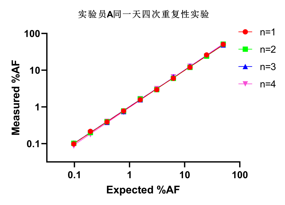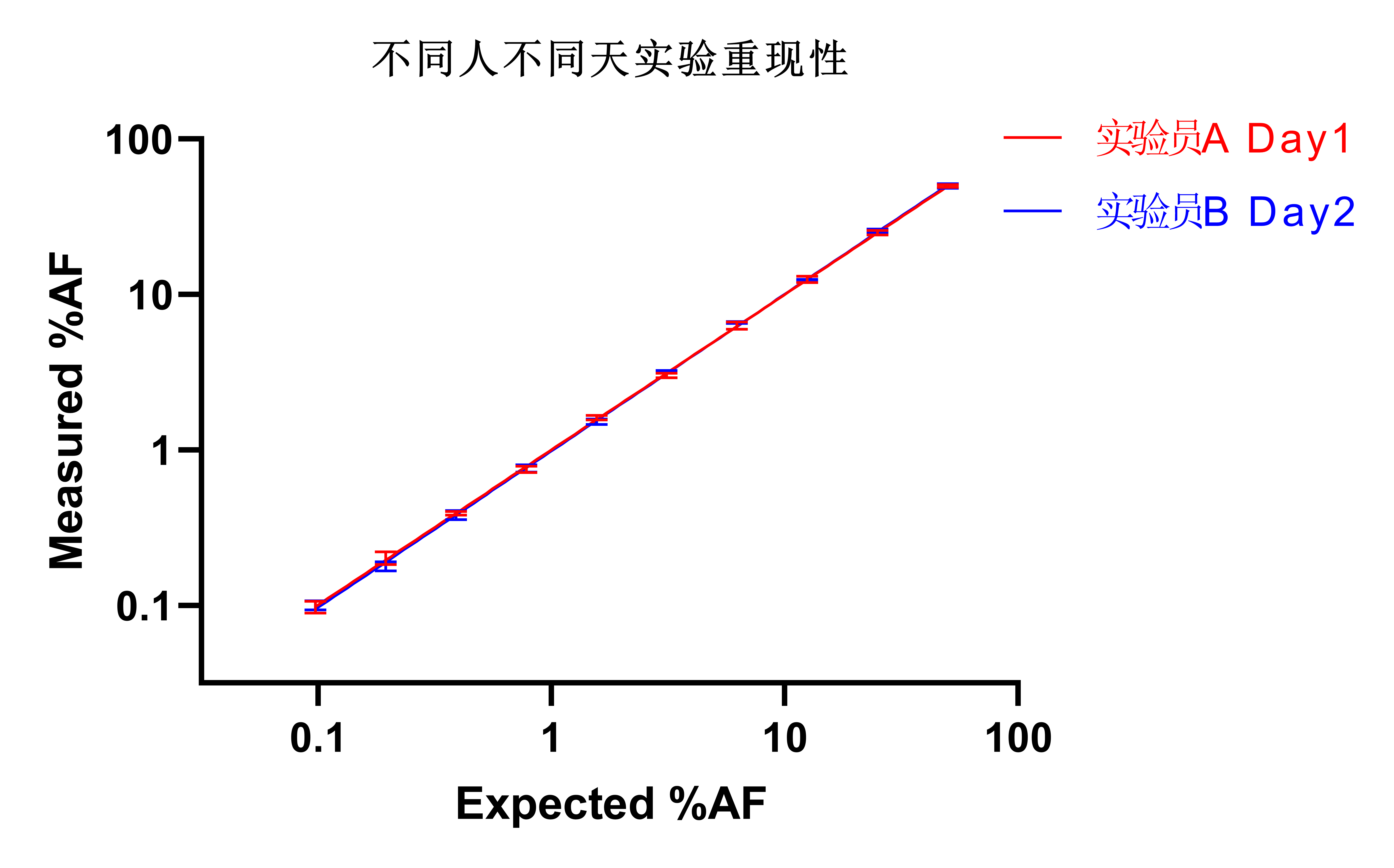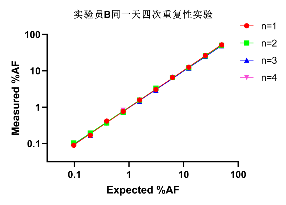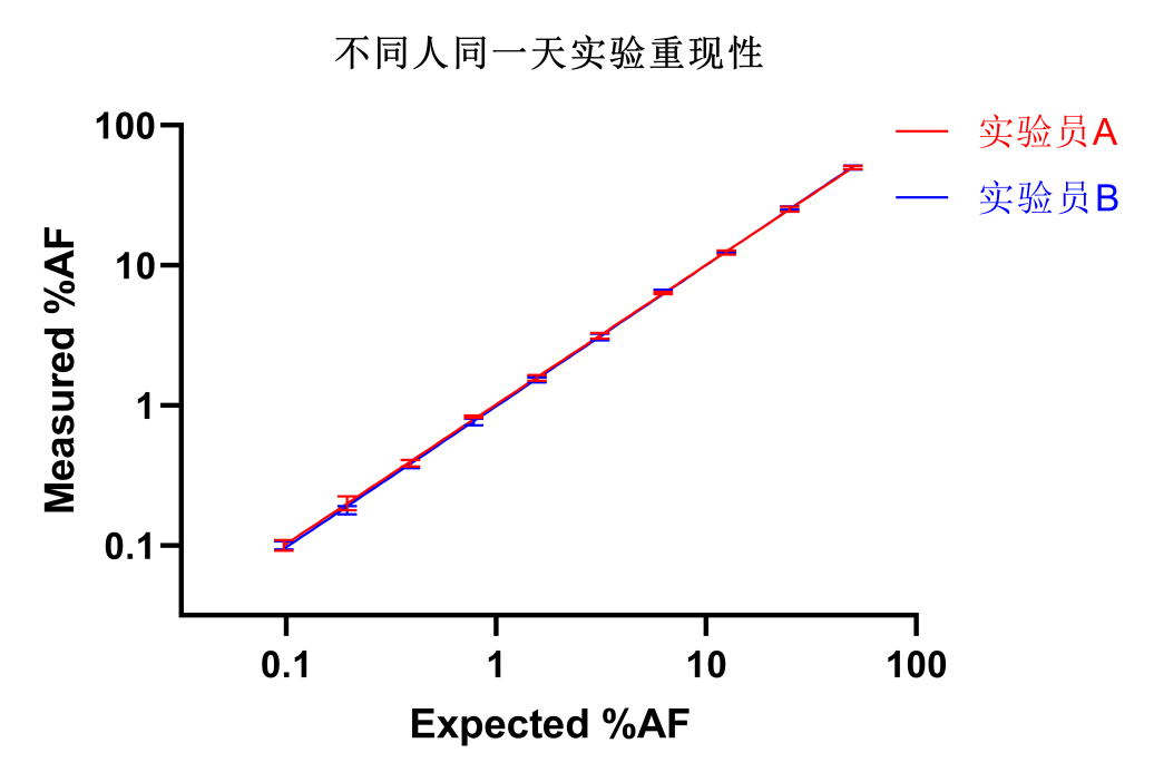 取10個(gè)不同AF(1%~50%)的標(biāo)準(zhǔn)品樣本,分別安排實(shí)驗(yàn)員A、實(shí)驗(yàn)員B在同一天,每人進(jìn)行四次檢測。