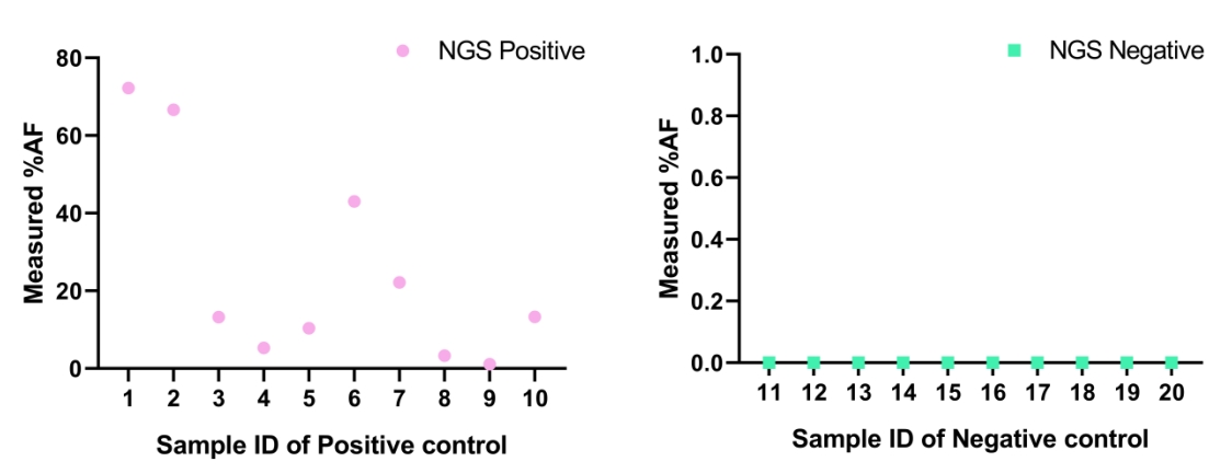 ①測試10個(gè)NGS陽性樣本,檢測結(jié)果均為陽性,陽性符合率100%,并定量檢出變異頻率。