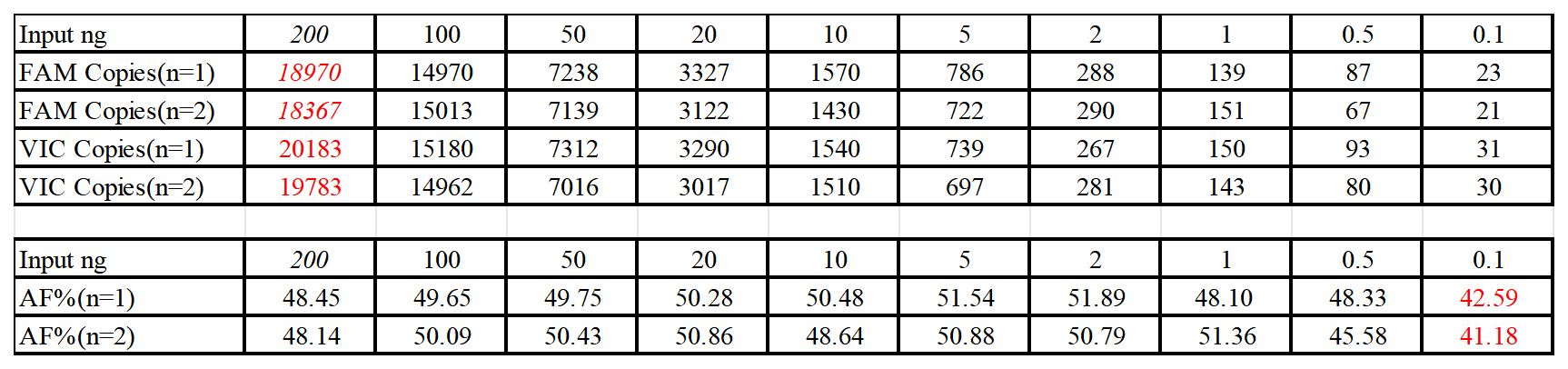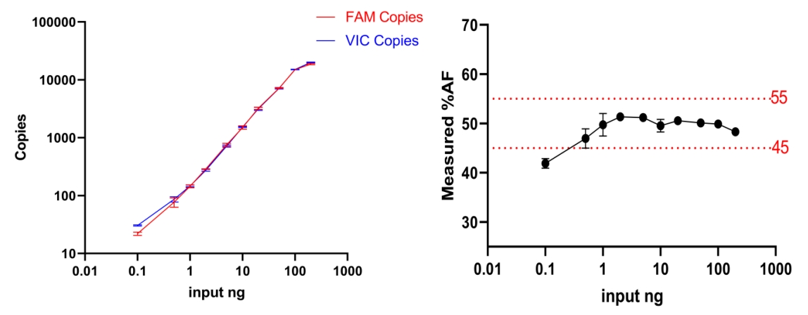 1.2 投入量在0.1ng~200ng間設(shè)置10個(gè)梯度,進(jìn)行數(shù)字PCR檢測(2復(fù)孔),判斷是否滿足%AF=50±10%波動(dòng)。