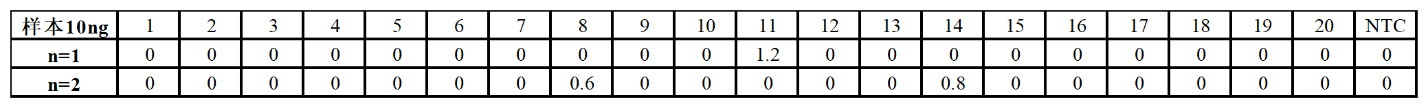 待測樣本:10個(gè)NGS驗(yàn)證為陽性的樣本(編號(hào)1-10); 10個(gè)NGS驗(yàn)證為陰性的樣本(編號(hào)11-20)。對20個(gè)樣本分別使用數(shù)字PCR檢測。