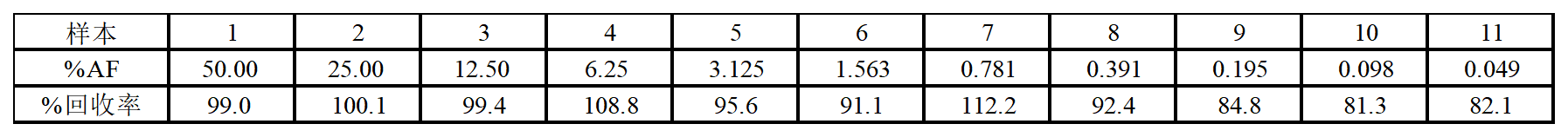 由上數(shù)據(jù)可見:當(dāng)AF在0.05%-50%范圍內(nèi),對應(yīng)的回收率在80-120%范圍,符合預(yù)期。