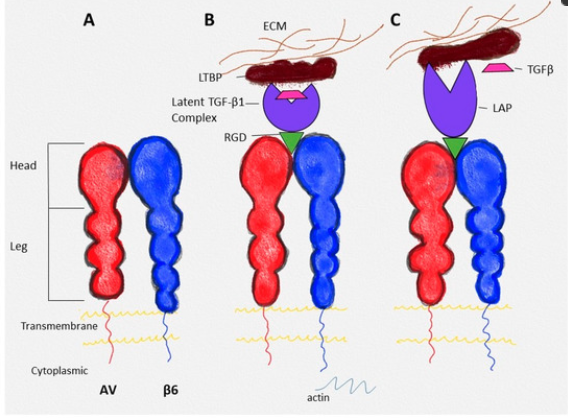 整合素αvβ6特異的配體主要配體包括細(xì)胞外基質(zhì)蛋白如纖維連接蛋白(Fibronectin)、層粘連蛋白(Laminin)以及潛活形式的TGF-β。潛伏期相關(guān)肽(LAP)是轉(zhuǎn)化生長因子β(TGF-β)前體肽的氨基末端結(jié)構(gòu)域,形成潛在的 TGF-β 復(fù)合物,并充當(dāng)整合素 αvβ6 的配體。當(dāng)整合素 αvβ6 通過LAP與細(xì)胞外位點(diǎn)的潛在TGF-β復(fù)合物結(jié)合時(shí),同時(shí)與細(xì)胞內(nèi)細(xì)胞骨架結(jié)合時(shí),活性TGF-β從潛在復(fù)合物中釋放出來,驅(qū)動纖維化和免疫抑制微環(huán)境形成;此外,αvβ6還可作為口蹄疫病毒(FMDV)等病原體的入侵受體。