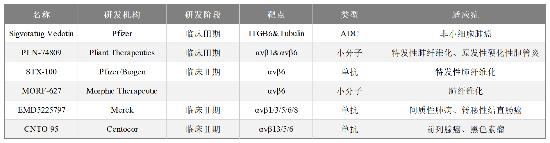 2025年JPM大會上,Pfizer 公布其Sigvotatug Vedotin(SGN-B6A)在非小細(xì)胞肺癌患者中良好的抗腫瘤活性和初步的療效,特別是在未接受過紫杉烷治療的非鱗狀NSCLC患者中,其療效更為顯著。整合素αvβ6作為纖維化和腫瘤治療的潛力靶點(diǎn),近年來藥物研發(fā)進(jìn)展迅速,涵蓋單抗、小分子、ADC及基因療法等領(lǐng)域。