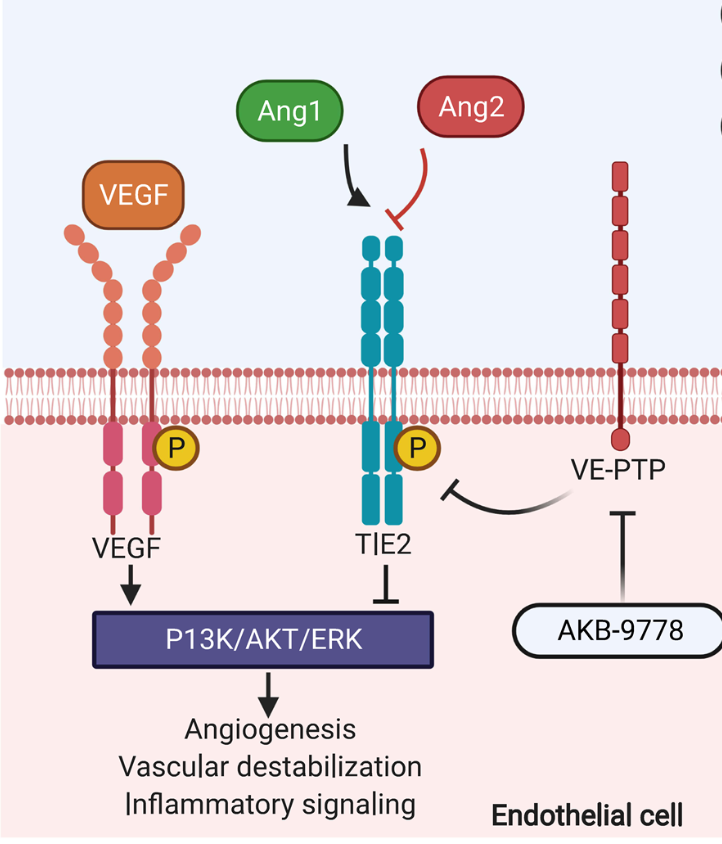 血管生成素蛋白家族由 血管生成素1(Ang1)、血管生成素2(Ang2)、血管生成素3(Ang3) 和血管生成素4(Ang4) 組成。Ang1和Ang2是Tie2的主要配體,Tie2是一種內(nèi)皮細(xì)胞特異性受體酪氨酸激酶。Tie2在血管生成素激活后經(jīng)歷特異性亞細(xì)胞定位。這種定位有助于區(qū)分靜止內(nèi)皮和血管生成內(nèi)皮之間的信號(hào)轉(zhuǎn)導(dǎo)結(jié)果。在運(yùn)動(dòng)的血管生成內(nèi)皮中,基質(zhì)結(jié)合的Ang1與Tie2結(jié)合并將其定位于細(xì)胞-細(xì)胞外基質(zhì)接觸,并繼續(xù)進(jìn)行細(xì)胞遷移和增殖過程。在靜止內(nèi)皮中,Ang1/Tie2 信號(hào)轉(zhuǎn)導(dǎo)將匯合內(nèi)皮細(xì)胞上的Tie2轉(zhuǎn)位到內(nèi)皮細(xì)胞-內(nèi)皮細(xì)胞連接處的簇中,并誘導(dǎo)促存活、內(nèi)皮緊密連接穩(wěn)定和抗炎信號(hào)。這主要是通過下游募集和激活PI3K以及隨后的Akt磷酸化來實(shí)現(xiàn)的。Akt信號(hào)轉(zhuǎn)導(dǎo)通過上調(diào)促存活分子(包括磷酸化內(nèi)皮一氧化氮合酶(eNOS) 和存活素表達(dá))來促進(jìn)內(nèi)皮細(xì)胞存活,同時(shí)抑制凋亡途徑,例如 caspase-9 和 B 細(xì)胞淋巴瘤 2 (BCL2) 相關(guān)細(xì)胞死亡激動(dòng)劑 (BAD)。
