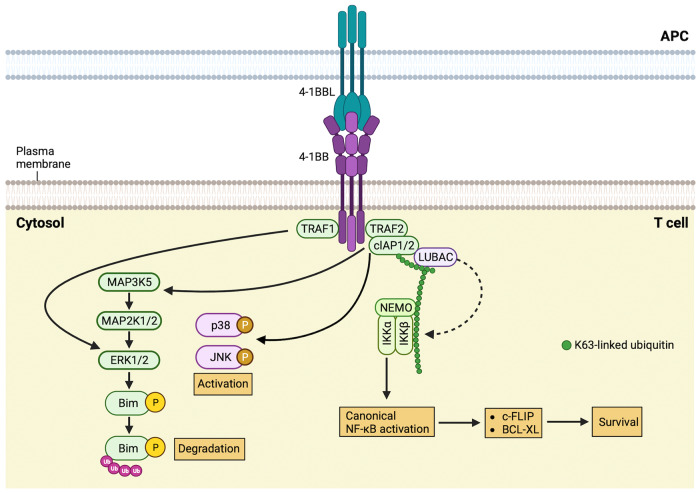 4-1BB的配體是4-1BBL(也稱為TNFSF9或CD137L)。4-1BBL是TNF超家族的II型膜蛋白。在與抗原呈遞細胞(APC)上的 4-1BBL 相互作用后,4-1BB 信號傳導(dǎo)首先將TRAF1和TRAF2與cIAP1和cIAP2一起募集到位于 4-1BB 細胞質(zhì)尾部的 TRAF 結(jié)合基序,形成 4-1BB 信號復(fù)合物。TRAF1 和 TRAF2 通過 TRAF1 刺激 ERK1/2 活性導(dǎo)致 ERK1/2 激活。ERK1/2 的激活還誘導(dǎo)促細胞凋亡蛋白 Bim 的磷酸化,使Bim的蛋白酶體降解,進而促進了 T 細胞存活。在 4-1BB 誘導(dǎo)的 NF-κB 激活的背景下,TRAF2-cIAP 復(fù)合物啟動 NF-κB 通路。IKK 復(fù)合物由三個亞基組成:兩個激酶 IKKα 和 IKKβ,以及調(diào)節(jié)亞基 NF-κB 必需調(diào)節(jié)劑 (NEMO;也稱為 IKKγ)。NF-κB誘導(dǎo)BCL-XL、BCL-2和c-FLIP的轉(zhuǎn)錄,刺激IL-2、IL-4和IFN-γ的表達,促進T細胞的存活和細胞毒性活性。此外,TRAF2 募集促進 JNK 和 p38 MAPK 通路的激活。JNK 易位到細胞核中,與轉(zhuǎn)錄因子 JUN 和 ATF2 相互作用,導(dǎo)致 T 細胞產(chǎn)生 IL-2、IL-4 和 IFN-γ。