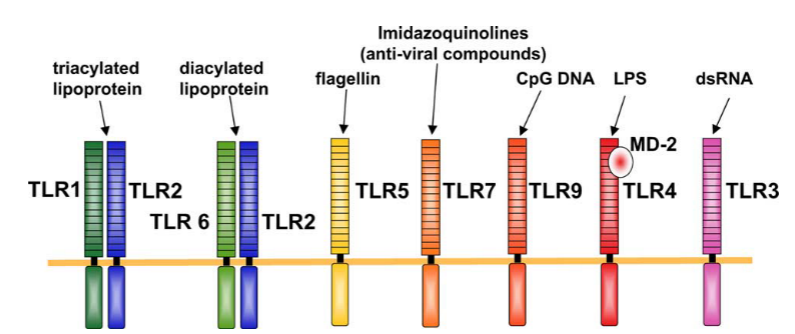 Toll樣受體(Toll like receptors,簡稱TLRs)是一類介導炎癥和先天性免疫的受體。TLRs是最早發(fā)現(xiàn)和最具特征性的模式識別受體,廣泛分布在巨噬細胞、樹突狀細胞等免疫細胞中,另外,還存在于像心肌細胞這樣的組織細胞中。