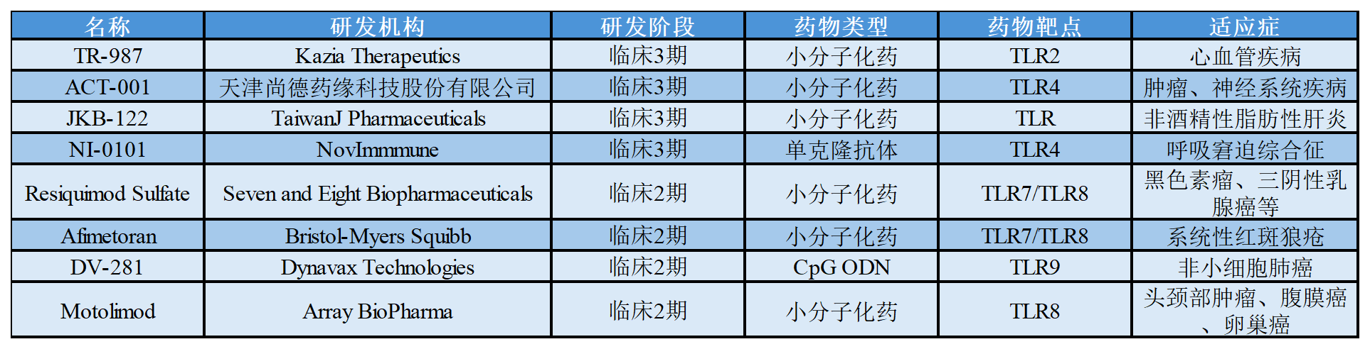 關于TLRs,目前常用的靶向療法主要聚焦于TLRs的激動劑,已有多款藥物批準上市:Emergent BioSolutions研發(fā)的Anthrax Vaccine Adsorbed作為一種預防性疫苗用于預防炭疽、Dynavax Technologies研發(fā)的Adjuvanted Hepatitis B vaccine用于預防肝炎、AIM ImmunoTech研發(fā)的安普利近、3M Health Care研發(fā)的咪喹莫特等。