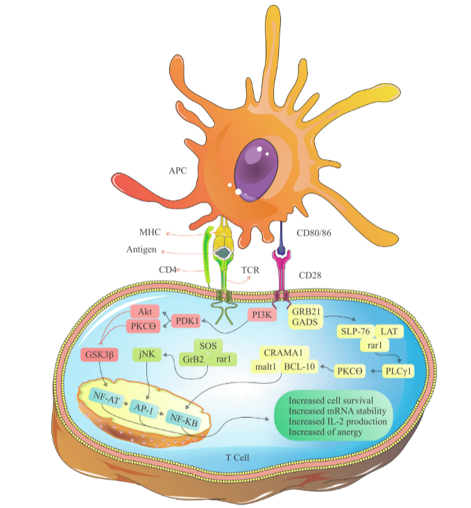 CTLA-4是由CTLA-4基因編碼的一種重要的跨膜蛋白。該蛋白屬于免疫球蛋白超家族(Immunoglobulin Superfamily, IgSF)成員,其結(jié)構(gòu)包括一個胞外免疫球蛋白可變區(qū)(IgV)結(jié)構(gòu)域、一個跨膜區(qū)以及一個胞內(nèi)結(jié)構(gòu)域。CTLA4與T細(xì)胞共刺激蛋白CD28同源,并且兩種分子在抗原呈遞細(xì)胞上分別與CD80和CD86(也稱為B7-1和B7-2)結(jié)合。CTLA-4以比CD28更大的親和力和親合力結(jié)合CD80和CD86,因此使其能夠勝過CD28的配體。CTLA4向T細(xì)胞傳遞抑制信號,而CD28傳遞刺激信號。CTLA4也在調(diào)節(jié)性T細(xì)胞(Tregs)中發(fā)現(xiàn)并有助于它們的抑制功能。通過T細(xì)胞受體和CD28的T細(xì)胞活化導(dǎo)致CTLA-4的表達(dá)增加。