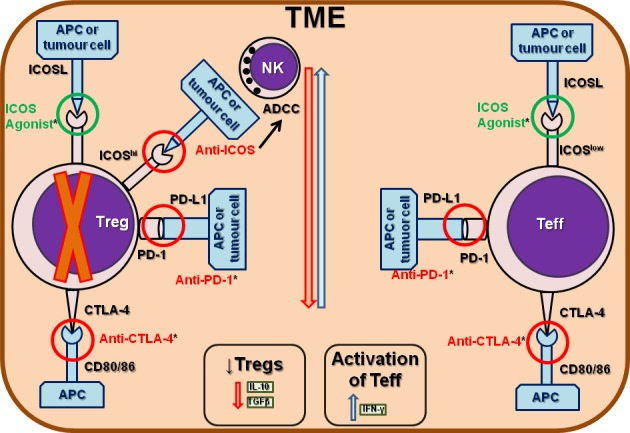 ICOS/ICOSL信號途徑已被證明可以促進(jìn)抗腫瘤T細(xì)胞反應(yīng)(當(dāng)在Th1和其他Teff中激活時)或Tregs中觸發(fā)的前體反應(yīng)。因此,針對這一途徑的激動性和拮抗性單克隆抗體正在被研究用于癌癥免疫療法。在臨床前研究中,ICOS激動性單克隆抗體增強了抗CTLA-4的作用。有文獻(xiàn)表明ICOS敲除小鼠對抗CTLA-4反應(yīng)不佳,表明ICOS信號傳導(dǎo)是有效抗腫瘤反應(yīng)所必需的,可能由Teff介導(dǎo)。因此,與單獨使用抗-CTLA-4相比,同時使用CTLA-4和ICOS刺激具有更好的抗腫瘤效果。有趣的是,使用抗-CTL a-4或抗-PD-1治療的小鼠和患者擴大了ICOShi(FoxP3-)CD4+和CD8+T細(xì)胞亞群,表明ICOShi T細(xì)胞可能是臨床反應(yīng)的重要生物標(biāo)志物,從而使治療受益。與癌癥免疫療法靶向的其他途徑相比,單獨使用ICOS似乎效果較差,主要是因為CD4+Tregs占主導(dǎo)地位。使用ICOS激動劑或拮抗劑Abs與CTLA-4或PD-1/PD-L1聯(lián)合使用有可能產(chǎn)生強效的協(xié)同作用。