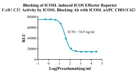 Figure 5. Blocking of ICOSL induced ICOS Effector Reporter Cell(C3) Activity by ICOSL Blocking Ab with ICOSL aAPC CHO(C42).