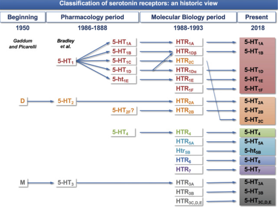5-HT2家族包括三種受體;5-HT2A、5-HT2B和5-HT2C具有42-51%的總氨基酸序列同源性,并且可以與Gq/G11偶聯(lián)以增加肌醇磷酸鹽的水解并提高細胞質(zhì)中Ca2+水平。此外,Gq/G11與其他轉(zhuǎn)導途徑(PI3K/Akt和ERK)的偶聯(lián)是明顯的。5-HT2C受體易于進行RNA編輯,導致多種不同的亞型,這些亞型可能顯示出改變的轉(zhuǎn)導效率以及優(yōu)選的轉(zhuǎn)導途徑偶聯(lián)。這種RNA編輯可以通過精神藥物進行調(diào)節(jié),從而以特定于大腦區(qū)域的方式改變這些受體的功能。