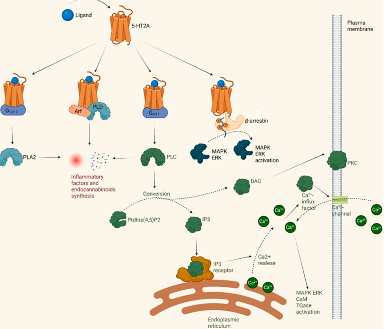 5-HT2A受體廣泛分布于中樞神經(jīng)系統(tǒng)(CNS)和外周組織中。在中樞神經(jīng)系統(tǒng)內(nèi),它主要位于富含血清素的區(qū)域,包括新皮層、嗅結(jié)節(jié)、海馬和杏仁核,以及邊緣和基底神經(jīng)節(jié)結(jié)構(gòu)7。5-HT2A受體在調(diào)節(jié)認知、情緒和神經(jīng)可塑性過程中起著關(guān)鍵作用。它在大腦皮層V層錐體神經(jīng)元的頂端樹突上的濃度特別高,能夠通過谷氨酸釋放調(diào)節(jié)和與其他受體系統(tǒng)的相互作用來調(diào)節(jié)工作記憶、注意力和其他執(zhí)行功能。這種受體對海馬和杏仁核功能至關(guān)重要,海馬和杏仁核是參與學習、記憶形成和情緒處理的關(guān)鍵結(jié)構(gòu)。這兩個區(qū)域都從中縫核接收密集的5-羥色胺能神經(jīng)支配,5-HT2A受體激活通過增強空間編碼精度、調(diào)節(jié)GABA等中間神經(jīng)元介導的抑制、促進記憶鞏固過程等過程調(diào)節(jié)其活性。影響這些過程與神經(jīng)系統(tǒng)疾病的治療有關(guān)。盡管5-HT2A受體拮抗劑(如氯氮平、哌替嗪)和反向或部分激動劑被廣泛用于治療精神分裂癥、認知障礙和偏頭痛,但在治療上使用其激動劑具有挑戰(zhàn)性。這種困難是因為受體可以激活不同的效應蛋白,特別是Gq和β-arrestin。Gq主要與受體結(jié)合,啟動磷脂酶C(PLCβ)的激活,然后導致肌醇三磷酸(IP3)和二酰基甘油(DAG)等次級信使的產(chǎn)生,導致鈣釋放和蛋白激酶C(PKC)激活12。此外,5-HT2A受體與β-arrestin相互作用,促進受體內(nèi)化和脫敏,同時也啟動不同的細胞內(nèi)信號級聯(lián)。這些機制導致不同的生理效應,如抗抑郁藥和致幻結(jié)果。