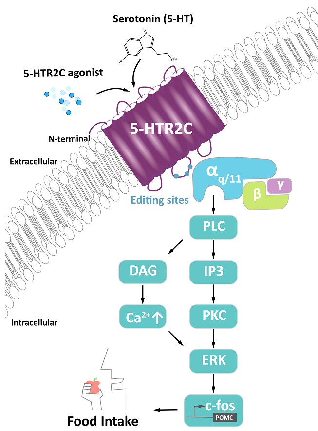 5-HTR2C是首批測序和克隆的5-HT受體之一。編碼5-HTR2C的基因位于人類染色體Xq24上。它含有三個內(nèi)含子(而不是兩個,如5-HTR2A和5-HTR2B),編碼一種具有七個跨膜區(qū)的蛋白質(zhì)產(chǎn)物。小鼠、大鼠和人類跨膜區(qū)5-HTR2C的同源性超過80%。與外周神經(jīng)系統(tǒng)相比,5-HTR2C在中樞神經(jīng)系統(tǒng)(CNS)中廣泛表達。在中樞神經(jīng)系統(tǒng)中,5-HTR2C在這些與能量代謝相關(guān)的已知腦區(qū)表達,包括腹側(cè)被蓋區(qū)(VTA)、弓狀核(ARC)、孤束核(NTS)、下丘腦室旁核(PVN)和外側(cè)臂旁核(LPBN)。對5-HTR2C功能喪失或獲得的遺傳研究表明,5-HTR2C在這些腦區(qū)維持能量穩(wěn)態(tài)中起著關(guān)鍵作用,已被證明可以調(diào)節(jié)能量穩(wěn)態(tài),包括進食和葡萄糖代謝。5-HTR2C的最佳理解功能是通過5-HTR2C在下丘腦的促阿片黑皮質(zhì)素(POMC)神經(jīng)元中的作用來調(diào)節(jié)食物攝入。血清素與5-HTR2C的結(jié)合導致異三聚體G蛋白的解離,該蛋白與5-HTR2C的第二個細胞內(nèi)環(huán)結(jié)合。解離后,亞基Gα/q11激活磷脂酶C,產(chǎn)生肌醇三磷酸(IP3)和二?;视停―AG),從而激活蛋白激酶C(PKC)。PKC激活細胞外調(diào)節(jié)激酶(ERK)通路,導致c-Fos磷酸化和POMC合成。POMC被加工成α-黑素細胞刺激激素(α-MSH),通過黑皮質(zhì)素4受體(MC4Rs)激活PVN中的神經(jīng)元。PVN神經(jīng)元的激活誘導飽腹感,即停止進食,這是一種厭食反應。