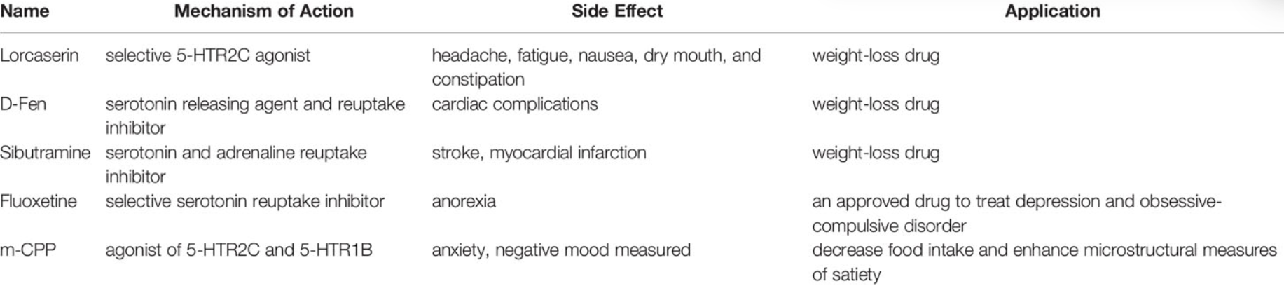 5-HTR2C是新型減肥藥物最有前景的靶點之一。許多靶向5-HT信號傳導的調(diào)節(jié)劑,包括西布曲明(血清素和腎上腺素再攝取抑制劑)、mCPP和芬氟拉明(也稱為氟西汀,選擇性血清素再攝取抑制劑。)已被用作食欲抑制劑。西布曲明和氟西汀可以在體內(nèi)增加細胞外血清素水平,非選擇性地刺激所有突觸后亞型,然后刺激5-HTR2C抑制食物攝入。Heisler報告稱,mCPP不會抑制5-HTR2C敲除小鼠的食物攝入,也會削弱芬氟拉明(血清素釋放劑和再攝取抑制劑)的吞咽作用,這表明5-HTR2C在d-芬氟拉明誘導飽腹感中起著關(guān)鍵作用。芬氟拉明是一種治療肥胖癥的有效藥物,以Pondimin®/Redux®的名義出售,可以降低食欲。芬氟拉明與血清素5-HTR2C結(jié)合較弱,d-Fen以高親和力結(jié)合并激活血清素5-HTR2B和5-HTR2C,以中等親和力結(jié)合并活化血清素5-HTR2A(115-117)。然而,芬氟拉明與心臟瓣膜病和肺動脈高壓的副作用有關(guān),促使其退出臨床使用。