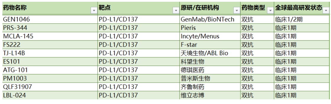 由于4-1BB在高度耗竭的PD-1高表達(dá)CD8+TIL上顯著表達(dá),并且在PD-1阻斷后進(jìn)一步上調(diào),而4-1BB信號(hào)傳導(dǎo)則會(huì)誘導(dǎo)CD8+TIL的克隆擴(kuò)增,CD8+TIL表現(xiàn)出腫瘤反應(yīng)性而無終末分化,因此4-1BB和PD-L1可能是誘導(dǎo)T細(xì)胞抗腫瘤反應(yīng)機(jī)制上的一對(duì)好搭檔。針對(duì)這兩者開發(fā)雙特異性抗體是一種極具前景的開發(fā)策略,引得國內(nèi)外玩家紛紛參與,目前已有十余款針對(duì)PD-L1/4-1BB的雙抗藥物處于不同的研發(fā)介段,下表列舉了部分已進(jìn)入臨床的雙抗藥物:
