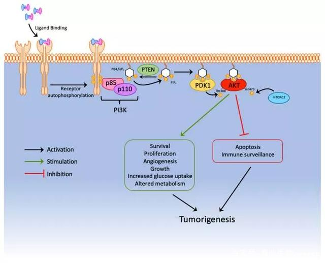 圖1. PTEN抑制PI3K途徑和AKT的下游致癌信號(hào)。通過使PIP3磷酸化,PTEN阻止了PDK1激活A(yù)KT,從而防止了腫瘤的發(fā)生。