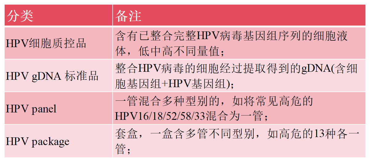 在試劑盒注冊申報方面,《人乳頭瘤病毒(HPV)核酸檢測及基因分型、試劑技術(shù)審查指導(dǎo)原則》中對企業(yè)參考品的相關(guān)描述:企業(yè)參考品的核酸性質(zhì)(DNA或RNA)應(yīng)與產(chǎn)品預(yù)期檢測的靶物質(zhì)一致。鑒于HPV病毒尚不能體外培養(yǎng),企業(yè)參考品可采用感染HPV的細胞系,也可采用人工克隆或合成的HPV基因組DNA(或轉(zhuǎn)錄RNA)等。