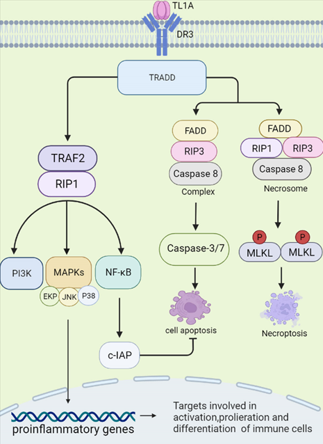 在靜息的T細(xì)胞中,DR3以可溶性形式表達(dá),保護(hù)細(xì)胞免于凋亡?;罨腡細(xì)胞表達(dá)跨膜DR3。sTL1A結(jié)合DR3 (膜結(jié)合形式)激活下游信號(hào)級(jí)聯(lián),從而調(diào)節(jié)免疫反應(yīng)和炎癥。sTL1A/DR3相互作用可觸發(fā)兩種不同的信號(hào)通路,分別引起炎癥和細(xì)胞凋亡。首先,DR3的死亡結(jié)構(gòu)域與細(xì)胞質(zhì)中的適配蛋白TNFR相關(guān)死亡結(jié)構(gòu)域蛋白(TRADD)結(jié)合,然后招募TNFR相關(guān)因子2 (TRAF2)和受體相互作用蛋白1 (RIP1)。這些復(fù)合物激活MAPKs (ERK、p38和JNK)、NF-κB和效應(yīng)激酶PI3K信號(hào)傳導(dǎo)。最后,激活的信號(hào)傳導(dǎo)調(diào)節(jié)促炎基因的表達(dá),參與免疫相關(guān)疾病的發(fā)生。TRADD結(jié)合FAS相關(guān)死亡結(jié)構(gòu)域(FADD)和RIP3,激活半胱氨酸天冬氨酸特異性蛋白酶-8 (caspase-8)形成復(fù)合物,進(jìn)一步激活下游caspase通路(如caspase-3和-7),誘導(dǎo)凋亡細(xì)胞死亡。當(dāng)caspase-8活性被阻斷時(shí),F(xiàn)ADD、RIP3、RIP1與下游效應(yīng)分子混合譜系激酶結(jié)構(gòu)域樣蛋白(mixed lineage kinase domain-like protein, MLKL)在磷酸化后形成胞質(zhì)“壞死體”復(fù)合體。然后,MLKL寡聚到細(xì)胞膜上,導(dǎo)致壞死性細(xì)胞死亡,這是一種伴有強(qiáng)烈炎癥的細(xì)胞死亡形式。在這個(gè)過(guò)程中,NF-κB被證明可以誘導(dǎo)細(xì)胞凋亡抑制蛋白(c-IAP)的激活,從而介導(dǎo)細(xì)胞凋亡的負(fù)反饋調(diào)節(jié)和抑制。事實(shí)上,更多的證據(jù)表明,sTL1A與DR3的連接優(yōu)先誘導(dǎo)淋巴細(xì)胞的促炎途徑而不是凋亡。